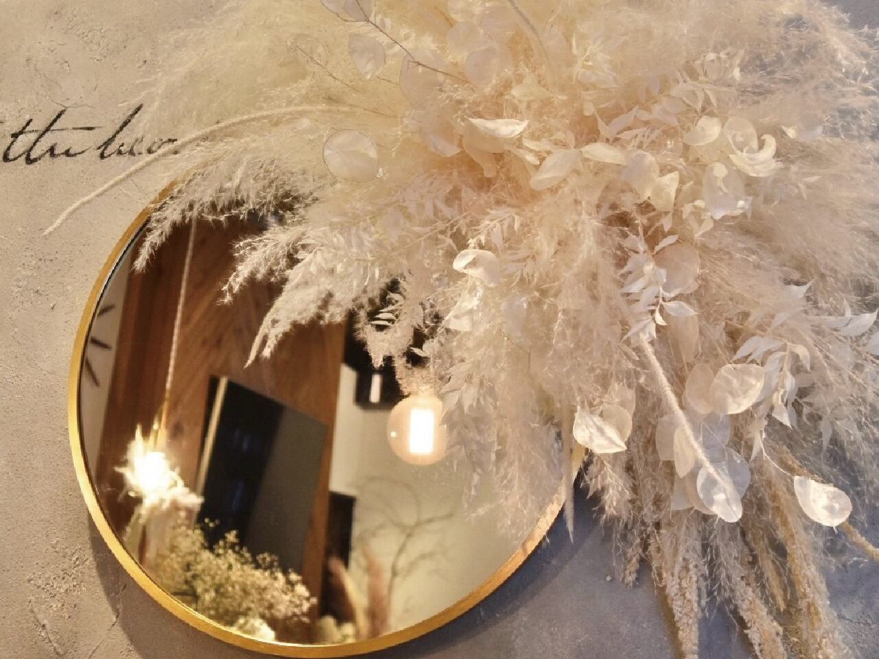 40cmのラウンドミラーに、ふわっと優雅なパンパススワッグをあしらったパンパスミラー。縁には上品なゴールドフレームを使用し、ナチュラルさと高級感が同居する洗練されたデザインに仕上げました。鏡としての実用性はもちろん、まるでアートのように空間を演出できるのが魅力です。サロンやカフェ、美容室など、人が集まる空間をぐっとセンス良く見せてくれるアイテムです。